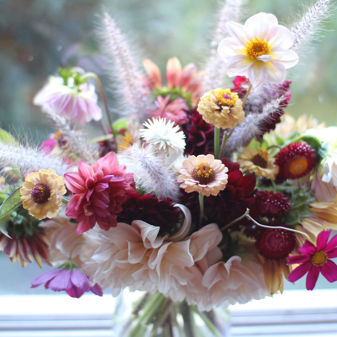 Some of the most beautiful kinds of flowers (such as dahlias) will droop relatively quickly, even with the best of care. If you particularly want your flowers to last a full week, let me know and I’ll try and source hardier blooms for you. Otherwise, I’ll choose the most beautiful flowers in season, regardless of whether their lives will be short and sweet, or long and lovely.
